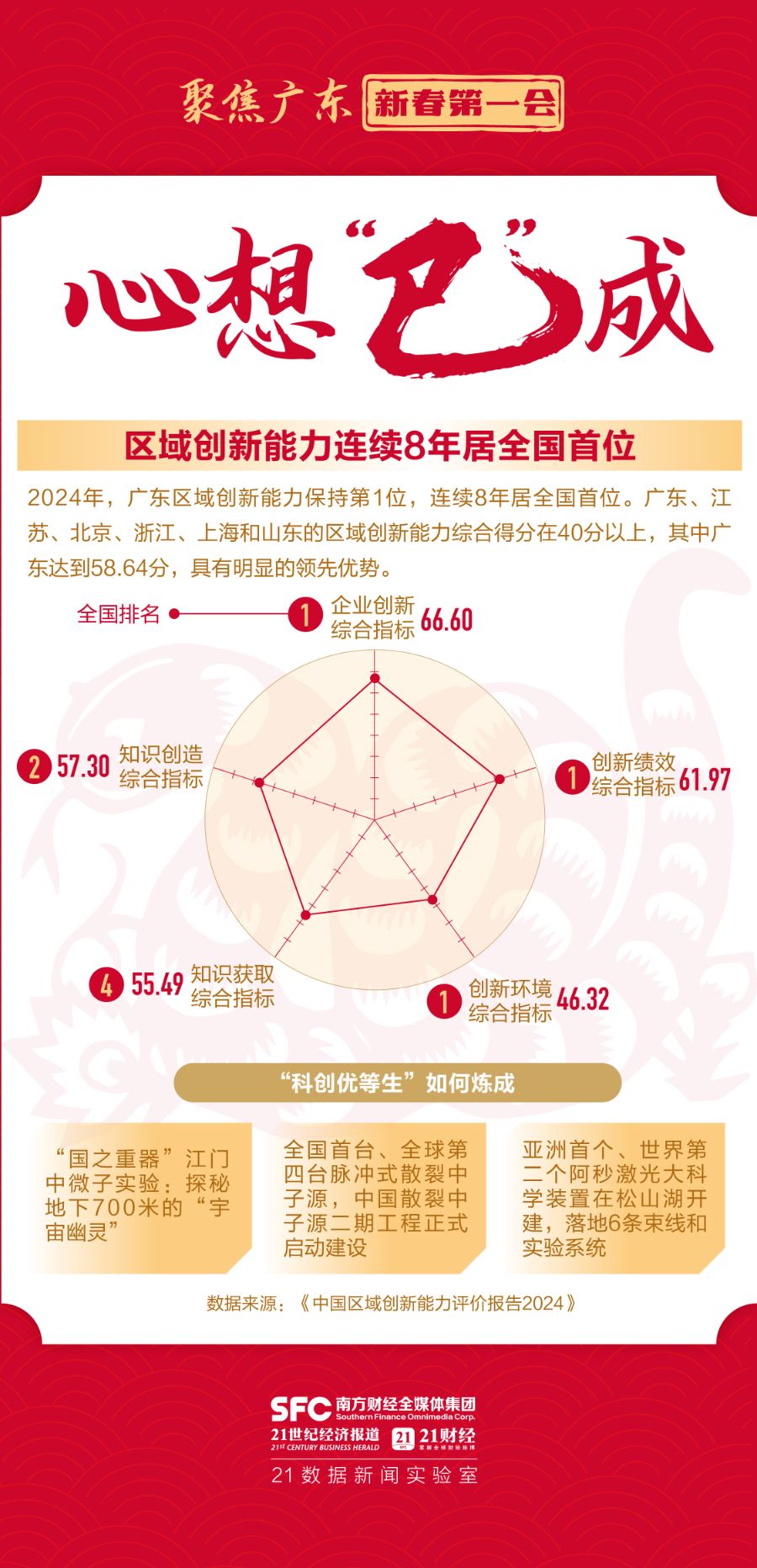2024年广东向“新”攀“高”,大力推动新质生产力发展壮大,经济总量连续36年全国第一,短短两年内连跨13万亿、14万亿台阶;低空经济规模已超千亿元,位居全国前列;全国有近一半工业机器人都是“广东造”;区域创新能力连续8年全国第一……
